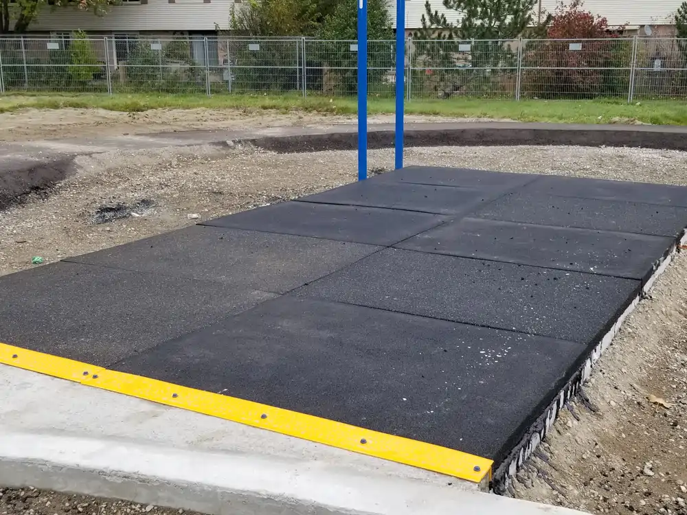 Other EVERPLAY PlayMats are intended to be used as single mats to provide lower maintenance of loose fill surfaces in areas of motion such as swings and slides or under sliding poles. The have bevels on all sides and are available in 3’x3’, and 4’x4’. EVERPLAY has added an anchoring system to reduce vandalism and theft.