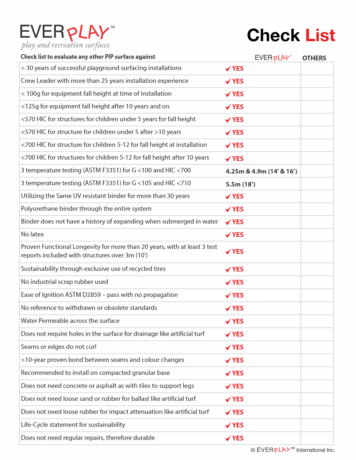 EVERPLAY brings the Owner/Operator the confidence their protective surfacing system will not only reduce the frequency and severity of injury over other PIP systems, but in all likelihood will have a lower overall Life-Cycle cost of almost all maintained protective surfaces, including EWF.